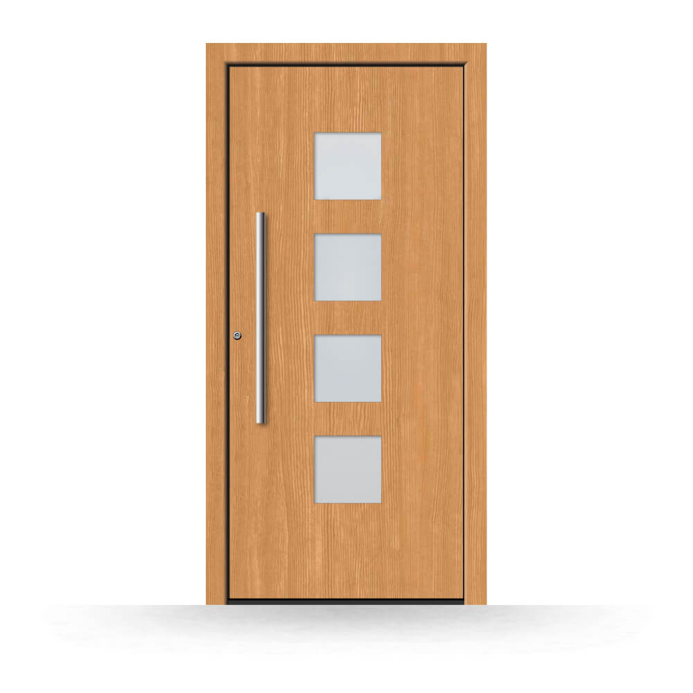 Parfois, l'esthétique d’une porte d’entrée peut être très simple : c'est le cas pour le modèle en bois Aywaille qui convainc par une subdivision géométrique de quatre petits inserts en verre sans encadrement. Il ne s’agit pas seulement d’un effet particulièrement moderne, mais également d’un avantage structurel car grâce aux quatre petites fenêtres, vous profitez d’une incidence élevée de la lumière naturelle, ce qui vous permet d'économiser la lumière électrique dans le couloir. En même temps, le profilé en bois massif fournit une excellente isolation thermique et acoustique et garantit une très haute sécurité.